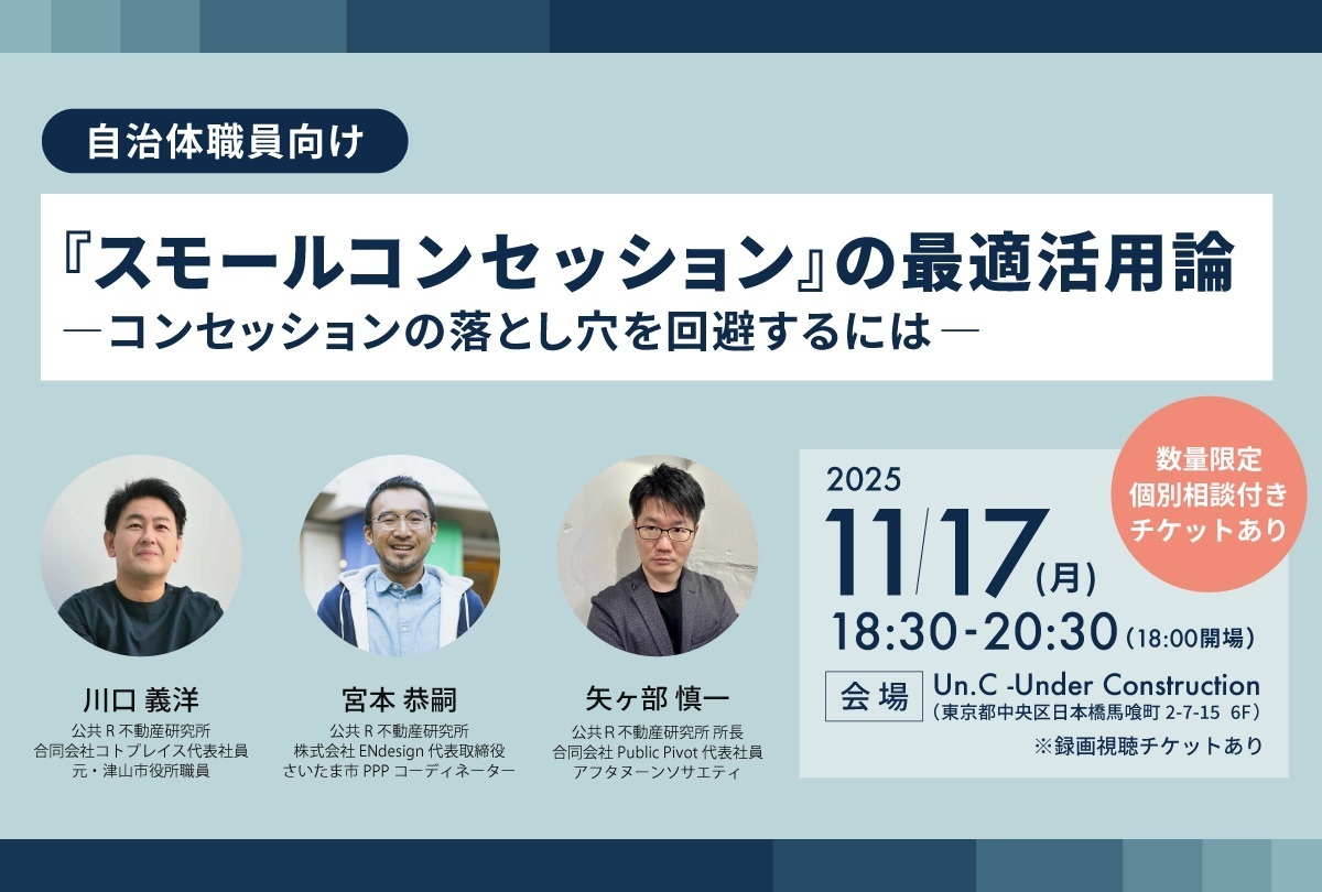 去る11月17日に公共R不動産主催の「スモールコンセッションの最適活用論〜コンセッションの落とし穴を回避するには〜」なるトークイベントに登壇してきました。
