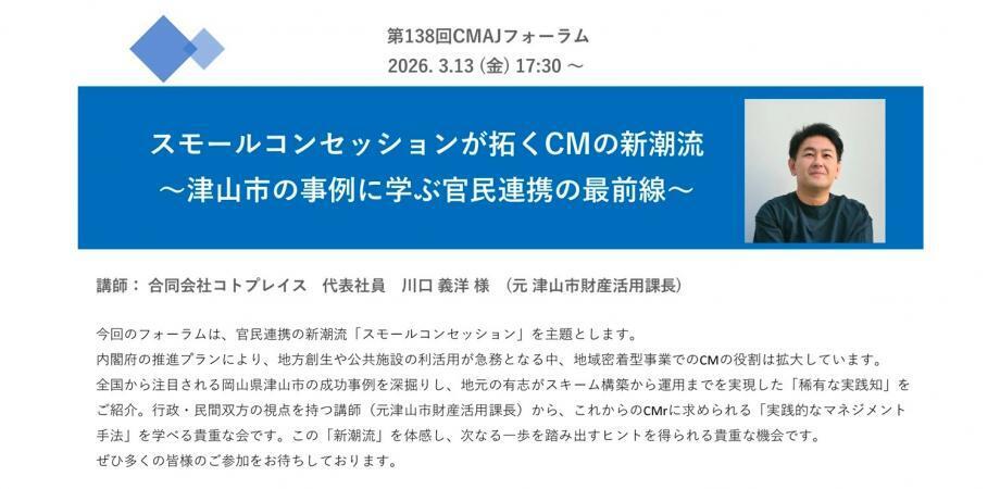 3月13日(金)17:30より、(一社)日本コンストラクションマネジメント(CM)協会が主催する「CMAJフォーラム」に登壇します。